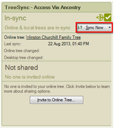 In Family Tree Maker, just go to the afternoon Sync tower on the top left corner and in the drop-down menu, select Sync Now.\