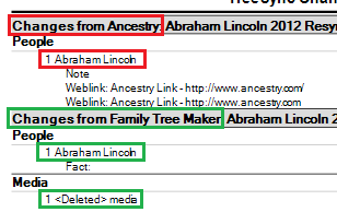 This will raise a display screen showing the change between Ancestry and the changes between Family Tree Maker and the change items. In the list you will see:
